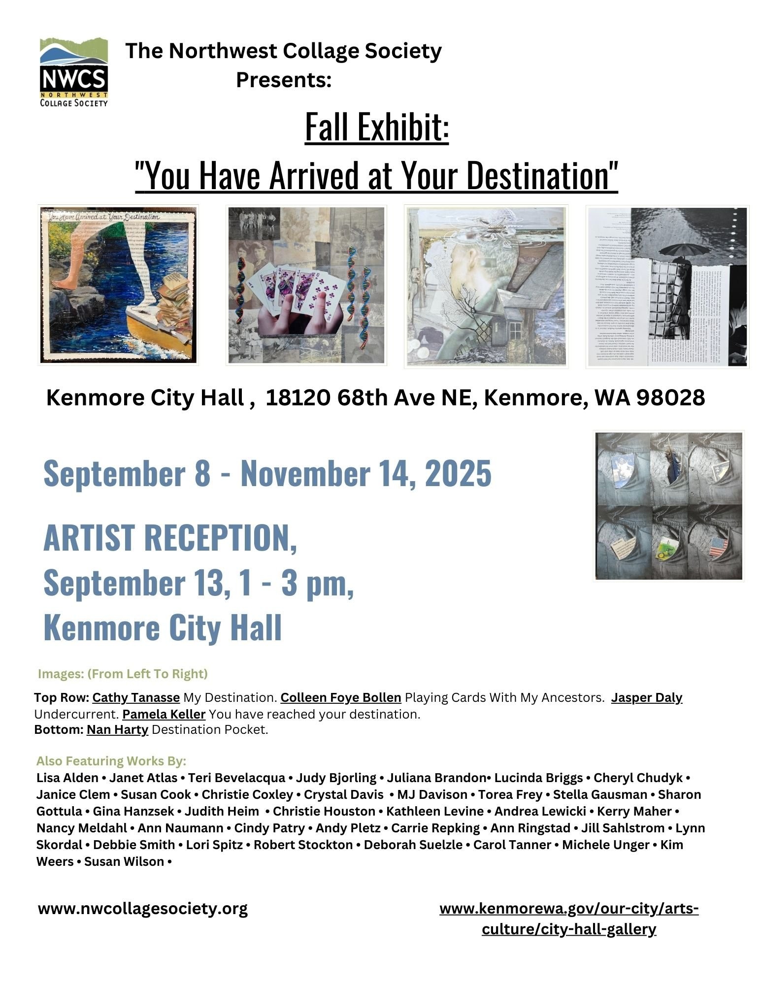 This Fall we will be exhibiting at Kenmore City Hall with the theme “You Have Arrived at Your Destination.” All artwork will be on 12x12 cradle board. See prospectus for details.